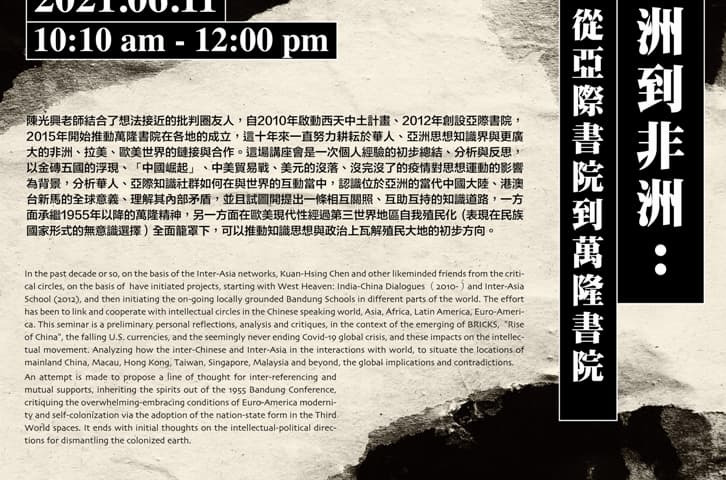 陳光興老師結合了想法接近的批判圈友人,自2010年啟動西天中土計畫、2012年創設亞際書院,2015年開始推動萬隆書院在各地的成立,這十年來一直努力耕耘於華人、亞洲思想知識界與更廣大的非洲、拉美、歐美世界的鏈接與合作。這場講座會是一次個人經驗的初步總結、分析與反思,以金磚五國的浮現、「中國崛起」、中美貿易戰、美元的沒落、沒完沒了的疫情對思想運動的影響為背景,分析華人、亞際知識社群如何在與世界的互動當中,認識位於亞洲的當代中國大陸、港澳台新馬的全球意義、理解其內部矛盾,並且試圖開提出一條相互關照、互助互持的知識道路,一方面承繼1955年以降的萬隆精神,另一方面在歐美現代性經過第三世界地區自我殖民化 (表現在民族國家形式的無意識選擇)全面籠罩下,可以推動知識思想與政治上瓦解殖民大地的初步方向。