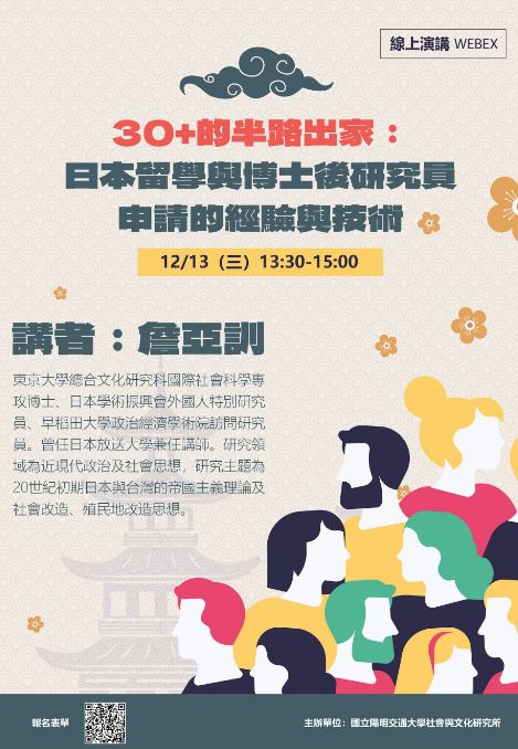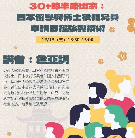 本次邀請所上畢業學姐詹亞訓,目前已成功申請日本東京大學總合文化研究科國際社會科學專攻博士,與我們分享在日本留學的心路歷程及申請經驗,歡迎同學報名參加!如果有想了解更多具體留學相關或是在日本求職的細節等,請填寫表單,留下你的問題!