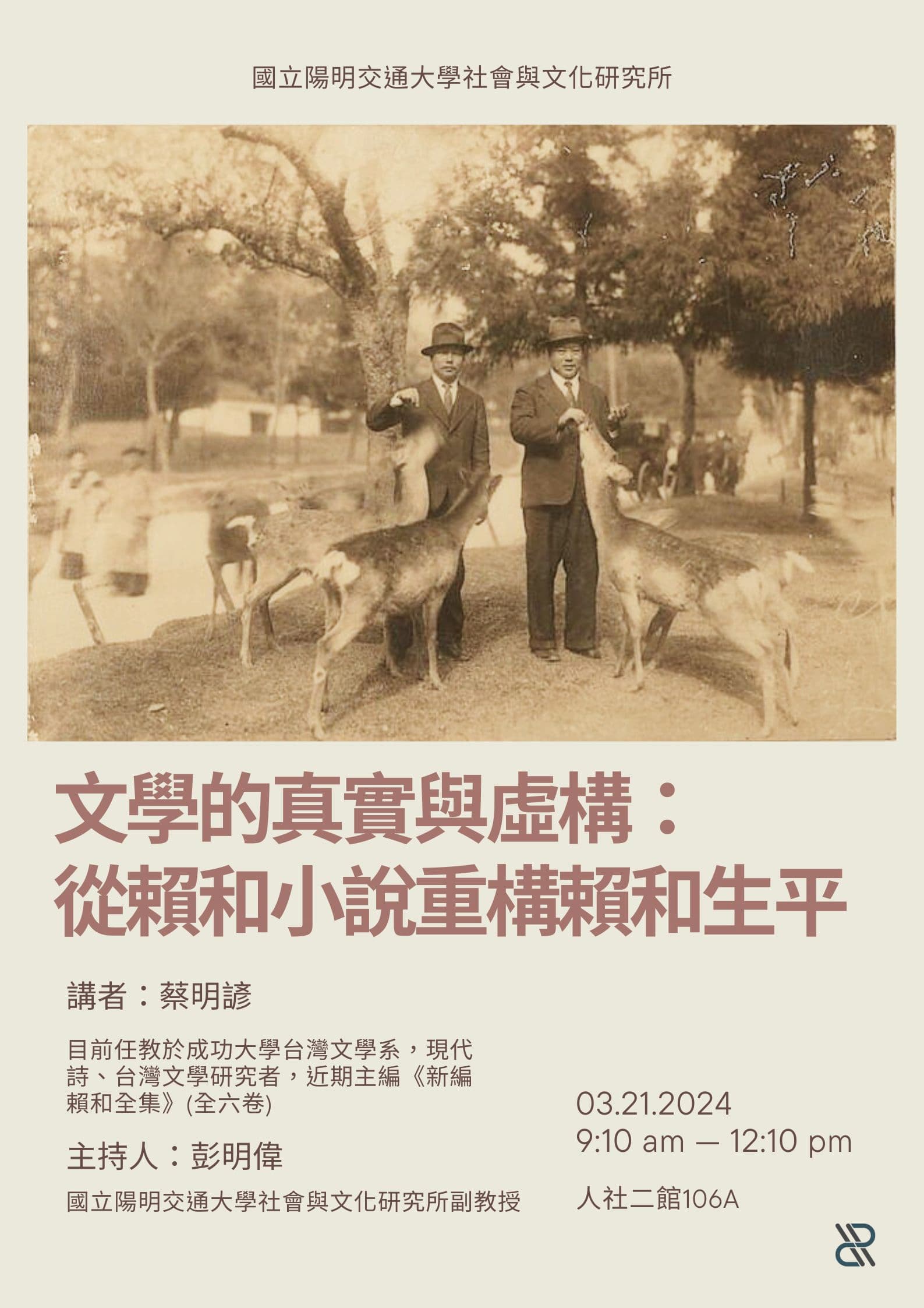 2024-03-20專題演講 TalksGH0746 文學的真實與虛構:從賴和小說重構賴和生平 講者: 蔡明諺 ( 國立成功大學台灣文學系 副教授) 時間:3/21(四)09:10-12:10 地點:人社二館 106A研討室 主持人:彭明偉(國立陽明交通大學社會與文化研究所 副教授) 主辦單位:國立陽明交通大學社會與文化研究所